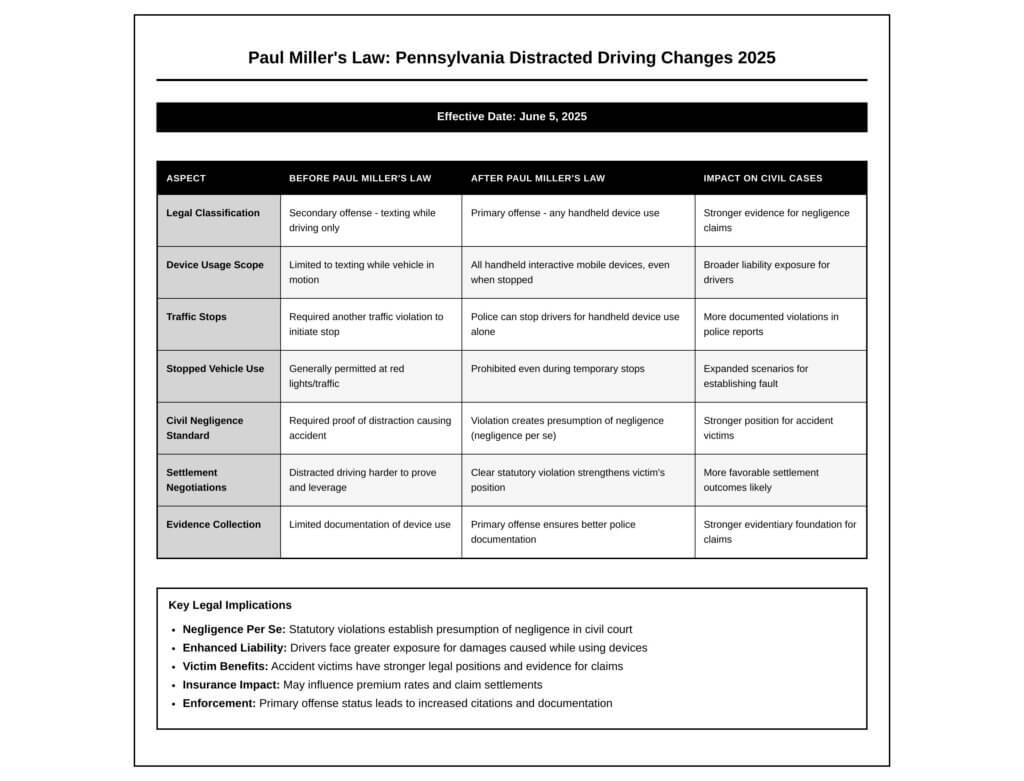 The enhanced distracted driving law has immediate implications for civil car accident cases. When a driver causes an accident while violating Paul Miller’s Law, this violation can serve as evidence of negligence per se – meaning the violation of the safety statute establishes a presumption of negligence in civil court. This strengthens the position of accident victims seeking compensation and may lead to more favorable settlement negotiations.